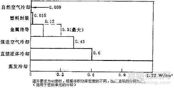 大部分熱設(shè)計適用于上面這個圖表,因為基本上散熱都是通過面散熱。但對于密封設(shè)備,則應(yīng)該用體積功率密度來估算,熱功率密度=熱量 / 體積。下圖是溫升要求不超過40℃時,不同體積功率密度所對應(yīng)的散熱方式。比如某電源調(diào)整芯片,熱耗為0.01W,體積為0.125cm3,體積功率密度=0.1/0.125=0.08W/cm3,查下圖得出金屬傳導(dǎo)冷卻可滿足要求。