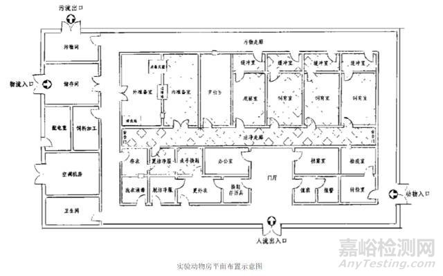 實驗動物房布置的關(guān)鍵在于人員、物品、動物以及污物進出不能相污染。布置實驗動物房的原則是需設(shè)有人員進入時的凈化更衣設(shè)施,物品進入時的消毒滅菌設(shè)施,還要有外來動物進入的待檢室、檢疫室,以及動物尸體、污物運出的污物走廊和專用的污物暫存間。