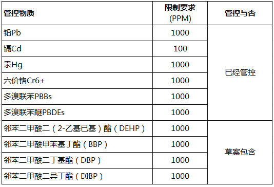 歐盟委員會已經(jīng)就RoHS2.0的修訂草案通知世界貿(mào)易組織WTO,該草案將原先4項被列為優(yōu)先評估物質(zhì)中的3項鄰苯加入管控要求中,此外還增加一項鄰苯DIBP,而放棄了對其中一項優(yōu)先評估物質(zhì)HBCDD的限制提案。如果該草案通過,RoHS2.0附件II將有十項強制管控物質(zhì),詳情參照下圖列表(點擊圖片看大圖)。
