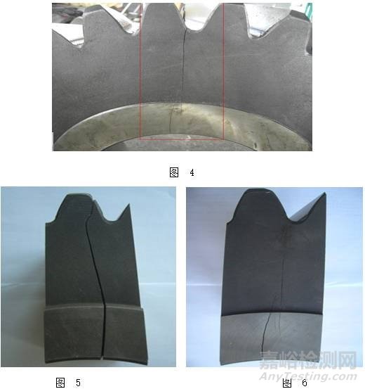 齒輪裂紋的宏觀形態(tài)分布(見圖2、圖3),齒輪一側(cè)裂紋從節(jié)圓處開始貫穿整個(gè)徑向厚度方向(見圖2),另一側(cè)裂紋分別從齒根和內(nèi)孔處開始幾乎貫穿整個(gè)徑向厚度方向(見圖3)。