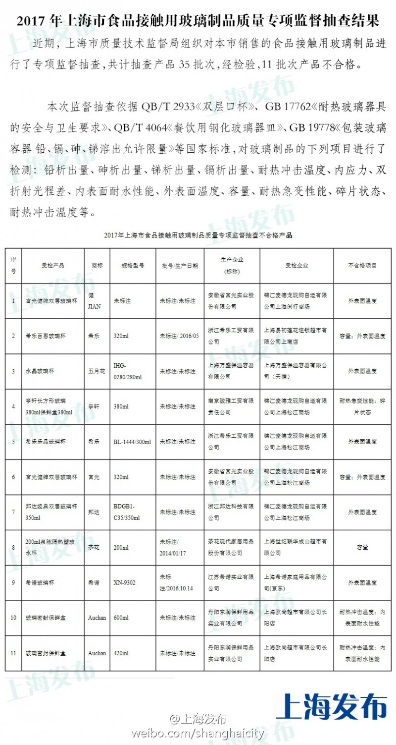 據(jù)上海發(fā)布,上海市質(zhì)量技術(shù)監(jiān)督局對本市銷售的食品接觸用玻璃制品進(jìn)行抽查發(fā)現(xiàn),富光健牌雙層玻璃杯、希樂百惠玻璃杯、Auchan玻璃密封保鮮盒等11批次食品接觸用玻璃制品涉外表面溫度、耐熱急變性能等問題。詳見下圖。