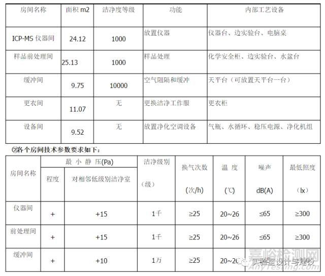 根據(jù)實驗室內(nèi)部布局將實驗室原有房間分隔成儀器間、樣品前處理間、緩沖間、更衣間和設(shè)備間,各個房間功能和作用見下表: