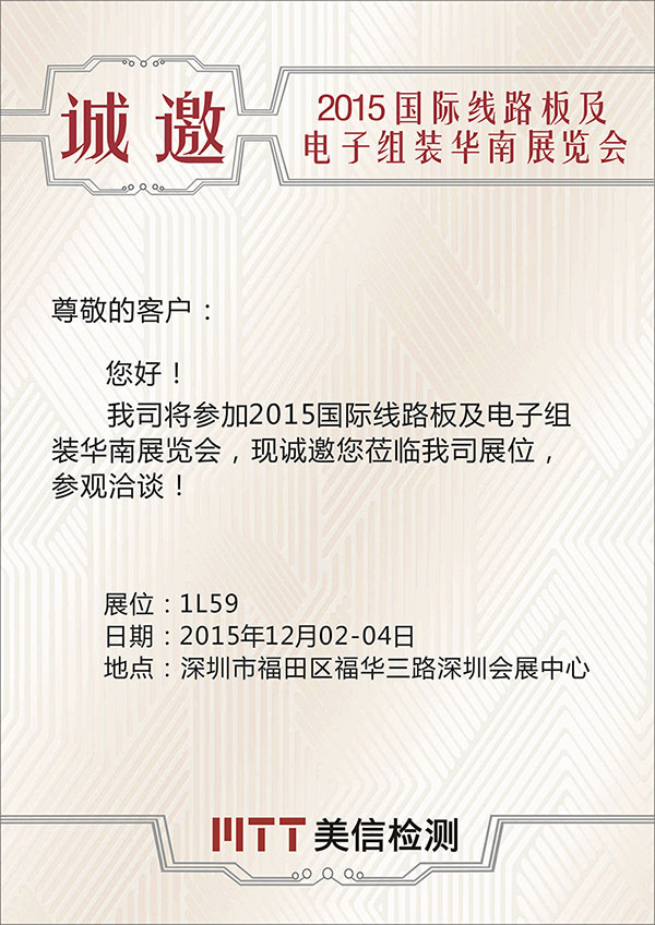 2015年12月2-4日,2015國際線路板及電子組裝華南展覽會(huì)將在深圳會(huì)展中心盛大開幕。作為華南地區(qū)線路板及電子組裝業(yè)的旗艦展會(huì),其影響力、代表性在業(yè)界早已享有盛名,美信檢測作為業(yè)界得力的合作伙伴,應(yīng)邀參加本次全球盛典。