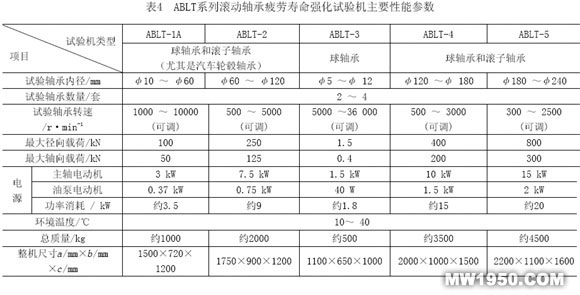在消化吸收和改進各種軸承壽命試驗機的基礎(chǔ)上,我國自行設(shè)計研制的ABLT(Accelerated Bearing Life Tester)系列滾動軸承疲勞壽命強化試驗機,具有完全自主知識產(chǎn)權(quán)的新型軸承壽命試驗技術(shù)和方法,通過個性化設(shè)計,能滿足大多數(shù)滾動軸承疲勞壽命強化試驗的需要。其主要性能參數(shù)如表4所示。