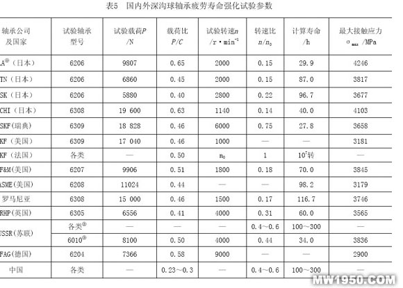 目前軸承行業(yè)廣泛采用的可靠性強化試驗技術(shù)是依據(jù)故障物理學(xué),把故障或失效當(dāng)作研究的主要對象,通過發(fā)現(xiàn)、研究和根治故障達到提高可靠性的目的。實踐證明,該方法效果顯著,并且與常規(guī)試驗技術(shù)具有等效性和可比性。前蘇聯(lián)、瑞典的SKF、日本的NSK、NTN、英國的RHP(現(xiàn)為日本NSK-RHP)、奧地利的STEYR(現(xiàn)為SKF-STEYR)、美國的SKF和F&M公司均采用加大試驗載荷來達到快速試驗的目的。日本和歐美等國家的深溝球軸承強化試驗中所采用的試驗載荷已經(jīng)接近或超過額定載荷的一半,如表5所示。
