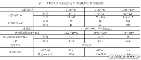 ZS型滾動軸承疲勞壽命試驗機的主要性能參數(shù)見表1