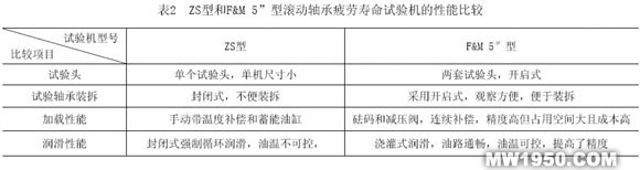 ZS型和F&M 5″型滾動軸承疲勞壽命試驗機的性能比較見表2。