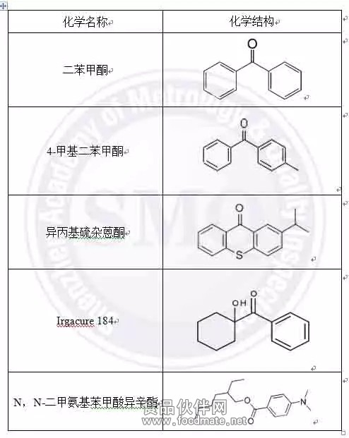 2011年,德國宣布召回從比利時進(jìn)口的冷凍細(xì)面條,主要原因是面條包裝上印刷油墨所含有的二苯甲酮(BP)滲透到面條中,導(dǎo)致面條被污染,遷移量達(dá)1747μg /kg;2009 年2 月,德國和比利時當(dāng)局向歐盟委員會(EC)發(fā)出警告,稱有些麥片可能被4-甲基二苯甲酮(4-MBP)污染,存在食品安全風(fēng)險;2005年,意大利、法國、西班牙和葡萄牙的雀巢嬰兒配方奶召回事件引起全社會的強(qiáng)烈反響,罪魁禍?zhǔn)拙褪桥浞侥碳埡斜砻嬗∷⒂湍械墓庖l(fā)劑2-異丙基硫雜蒽酮(2-ITX)和N,N-二甲氨基苯甲酸異辛酯(EHDAB),其遷移量高達(dá)120~300μg /L。食品中由于光引發(fā)劑殘留遷移而引發(fā)的食品安全事件屢見不鮮,引起了社會公眾的關(guān)注,到底光引發(fā)劑是什么?它有什么危害?下面就由小編為你簡單介紹一下。