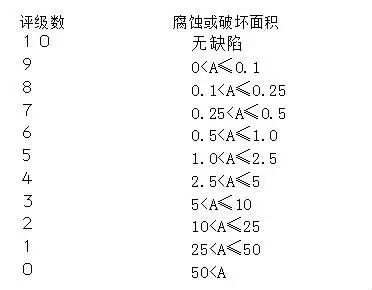 評(píng)定結(jié)果為 Ri 后加一個(gè)阿拉伯?dāng)?shù)字,如 Ri6, Ri4.?dāng)?shù)字表示腐蝕面積