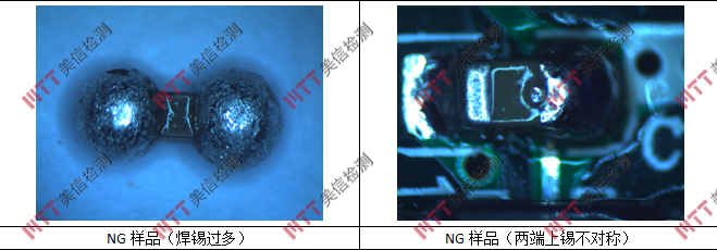 外觀檢查中可以看發(fā)現(xiàn),該MLCC焊接存在焊錫過多以及兩端上錫不對稱現(xiàn)象,可以判定該MLCC的焊接方式為手工焊接,且焊接質量較差。