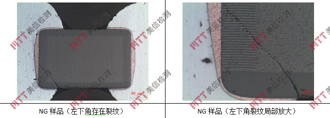 對樣品進行切片制樣,利用金相顯微鏡觀察發(fā)現(xiàn),失效MLCC內部存在典型的機械應力裂紋。