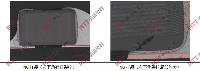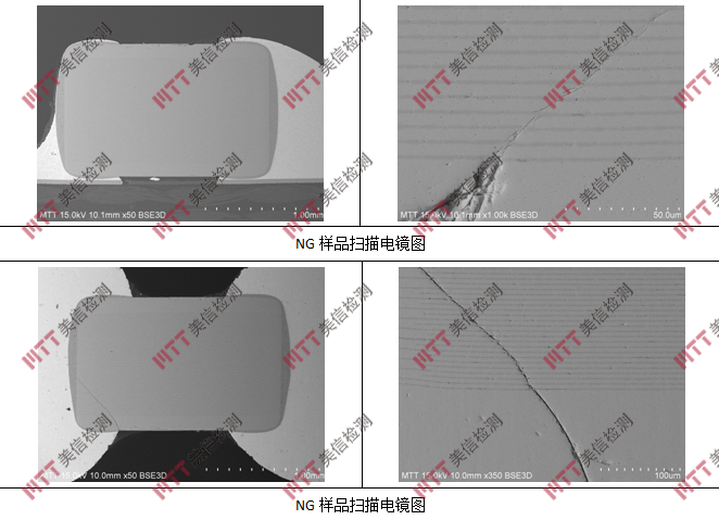 對切片進一步采用SEM/EDS分析, OK樣品未發(fā)現(xiàn)明顯異常,NG樣品均存在明顯裂紋,除此之外,未發(fā)現(xiàn)明顯異常。