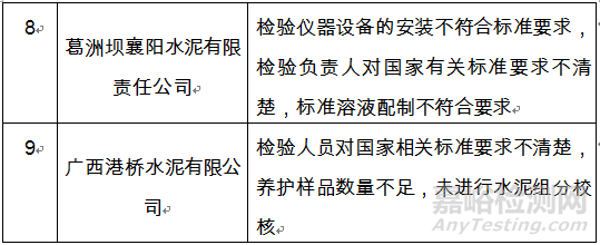 本次監(jiān)督檢查共對(duì)20家水泥產(chǎn)品生產(chǎn)許可獲證企業(yè)進(jìn)行了現(xiàn)場(chǎng)檢查,其中天瑞集團(tuán)許昌水泥有限公司,江西三環(huán)水泥有限公司,東方希望重慶水泥有限公司,葛洲壩襄陽水泥有限責(zé)任公司,廣西港橋水泥有限公司等5家企業(yè)存在嚴(yán)重問題,主要問題包括:無出廠檢驗(yàn)數(shù)據(jù),檢驗(yàn)儀器設(shè)備維護(hù)不當(dāng),檢驗(yàn)儀器設(shè)備的安裝、稱量等不符合標(biāo)準(zhǔn)要求,檢驗(yàn)員對(duì)國家相關(guān)標(biāo)準(zhǔn)要求不清楚,樣品養(yǎng)護(hù)水溫不符合標(biāo)準(zhǔn)要求,標(biāo)準(zhǔn)溶液配制不符合要求等,檢查結(jié)論為不合格。