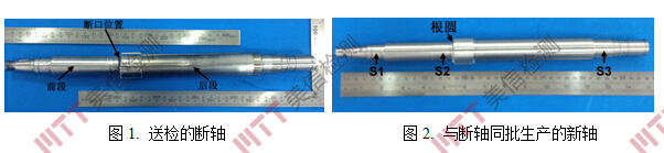 某型電機(jī)是叉車行走電機(jī),出廠前做行走測(cè)試時(shí)電機(jī)軸斷裂。為找出斷裂原因,給改善產(chǎn)品質(zhì)量提供依據(jù),需做失效分析。圖1為送檢的斷軸; 圖2 是與斷軸同批次生產(chǎn),未使用的新軸,做失效分析對(duì)比用。 為后面敘述方便,在圖1中標(biāo)出斷口位置,斷口左邊的部分標(biāo)為“前段”,斷口右邊的部分用“后段”表示;在圖2中,將斷裂處的R用“根圓”標(biāo)示,電機(jī)軸有3處軸承配合表面,分別用S1~S3標(biāo)示。