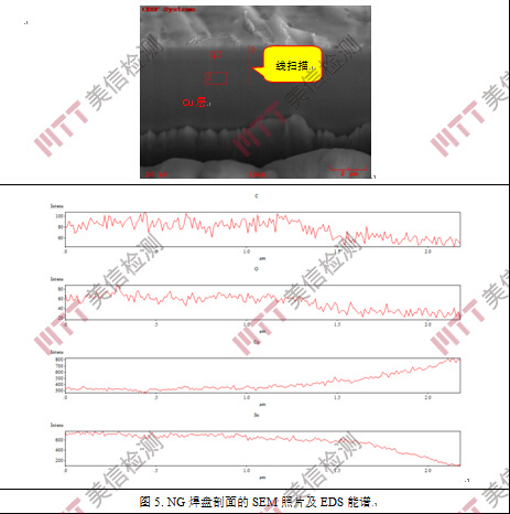 a). NG焊盤表面純錫層已經(jīng)完全消耗殆盡(表層氧化,內(nèi)部則轉(zhuǎn)化為金屬間化合物),不能滿足良好的可焊性要求;