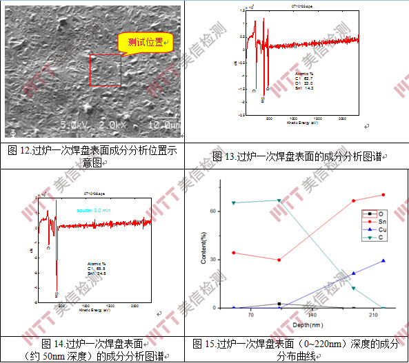對NG焊盤和過爐一次焊盤的極表面成分進行分析, NG焊盤在0~200nm深度范圍內(nèi),主要為Sn、O元素,200~350nm深度范圍內(nèi),為銅錫合金,幾乎不存在純錫層;過爐一次焊盤在0~140nm深度范圍內(nèi)主要為錫層,之后出現(xiàn)元素Cu(金屬化合物),如圖12~15所示。