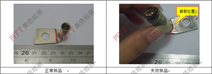 失效樣品為某汽車接地線束的固定端子,生產(chǎn)流程為:原料銅管→裁剪→沖壓成型→表面鍍錫→裝配→振動(dòng)試驗(yàn)(19萬次)→斷裂;其可靠性測試中6個(gè)成品經(jīng)振動(dòng)試驗(yàn)19萬次后其中一個(gè)斷裂,委托方要求分析該斷裂失效端子的失效機(jī)理,并給出改進(jìn)建議。