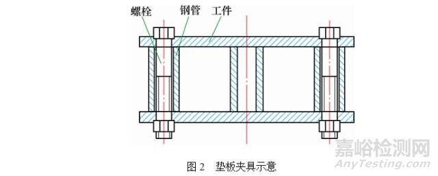 既然變形方向一致,我們就對四角翹起現(xiàn)象進(jìn)行阻止,另一方面,雖然滲碳過程中熱應(yīng)力不會產(chǎn)生較大變形,但為了防止其微小變形,并為了對沉孔起保護(hù)作用,不讓其因滲碳而增加脆性,我們對第二批工件在滲碳之初利用工件的沉頭孔,用螺栓作為夾具對其固定,為了保證各面受力均等且冷速較快,我們在螺栓中間穿入φ50mm×80mm的鋼管,且嚴(yán)格控制鋼管長度(80±0.1)mm,如圖2所示,之后對其進(jìn)行滲碳淬火,在保證工藝正確的前提下,我們對其變形再一次進(jìn)行了檢查,結(jié)果如表2。