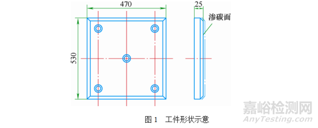 該件材質(zhì)20CrMnMo,滲碳前單面余量(1+0.1)mm。尺寸約為530mm×470mm×25mm,具體如圖1所示,硬度要求:≥55HRC。