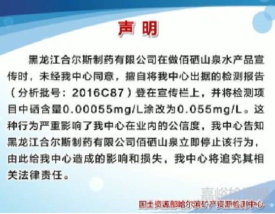 據(jù)了解,2016年12月6日前后,國土資源部哈爾濱礦產(chǎn)資源監(jiān)督檢測中心(以下簡稱監(jiān)督檢測中心)發(fā)布聲明稱:生產(chǎn)佰硒山泉包裝飲用水的合爾斯制藥有限公司,在做佰硒山泉水產(chǎn)品宣傳時(shí),未經(jīng)其同意就擅自把他們出據(jù)的檢測報(bào)告(分析批號(hào):2016C87)登在宣傳欄上,并將檢測項(xiàng)目中硒含量0.00055mg/L涂改為0.055mg/L。