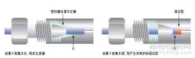 管線可能太長或太短——這種情況可能導(dǎo)致滲漏或峰分叉/拖尾,如圖2所示。如果管線太長,密封圈位置不當(dāng),將發(fā)生滲漏。如果管線推出的距離不夠,將會產(chǎn)生一段死空間,形成混合腔,導(dǎo)致柱外體積,使峰形變壞。如果您使用的是不同廠商的色譜柱,一定要確保使用正確的接頭,并保證色譜柱末端接頭位置正確。