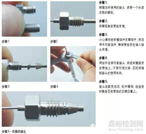 安捷倫推薦帶前后墊圈的 Swagelok 型接頭,能讓安捷倫液相色譜系統(tǒng)獲得最佳性能。在所有儀器連接處都可以使用這種接頭,包括閥、加熱器、連接色譜柱等。進行良好連接的步驟如圖3: