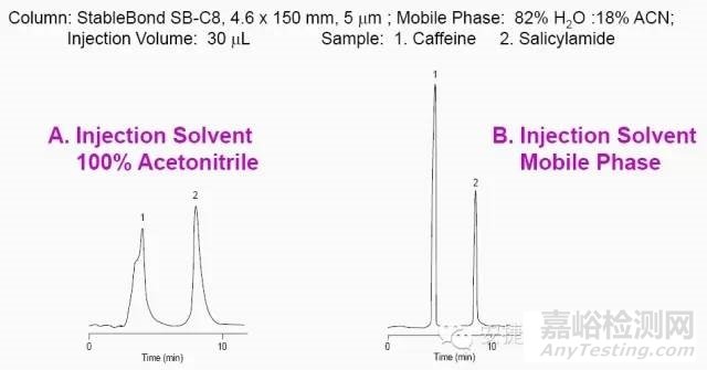在反相 LC 中, 如使用 100% 有機溶劑或 100% 強溶劑(圖4中為乙腈),大體積進樣時,將使色譜峰過早洗脫出色譜柱,導(dǎo)致峰變形。如需解決這個問題可以對分析物進行蒸發(fā)濃縮,從而減少進樣體積。或者進樣溶劑改為用水稀釋,與流動相更為兼容,即使進樣體積較大也不會出現(xiàn)峰變形。較早流出的峰或靠近溶劑前沿的峰更容易出現(xiàn)拖尾。在液相色譜中用溶于流動相的小體積進樣最為理想。