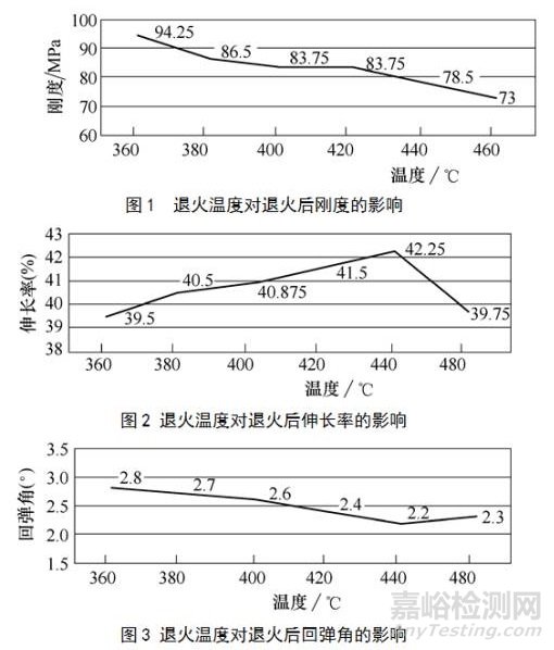 采用T2銅桿拉制3×10銅扁線,分別在360℃、380℃、400℃、420℃、440℃、460℃下保溫3小時(shí),退火后各項(xiàng)機(jī)械性能如圖1~3所示。