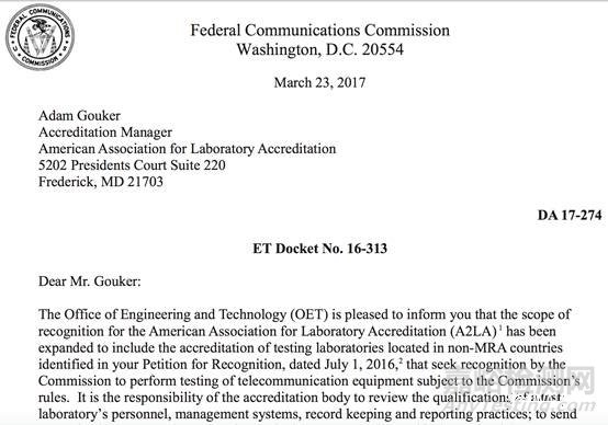 美國聯(lián)邦通信委員會(FCC)已于2017年3月23日正式授權(quán)A2LA和 NVLAP,可以對未簽署實(shí)驗(yàn)室認(rèn)可互認(rèn)協(xié)議(MRA)的國家和地區(qū)的測試實(shí)驗(yàn)室進(jìn)行審核,包括中國在內(nèi)。在FCC新規(guī)實(shí)施的一年延長期過后,即2017年7月13日開始,通過A2LA審核的中國國內(nèi)實(shí)驗(yàn)室,將可以進(jìn)行FCC DoC以及FCC Certification的測試,并申請相應(yīng)證書,無需將樣品送至國外實(shí)驗(yàn)室。