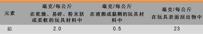 鉛的現(xiàn)行限值為:在干燥的玩具材料(例如粉筆)中為每公斤13.5毫克,在液態(tài)或黏稠的玩具材料(例如手指畫顏料)中為每公斤3.4毫克,在玩具表面刮出物(例如涂料)中為每公斤160毫克。