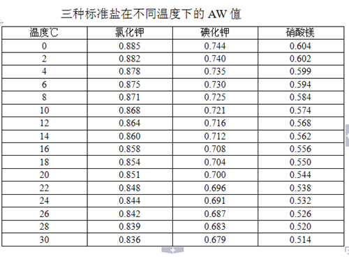 3、對(duì)照附件1看此標(biāo)準(zhǔn)溶液在該溫度下的水活度和附件中標(biāo)準(zhǔn)值對(duì)照是否正確,如正確表明可進(jìn)行測(cè)量。