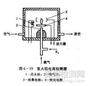 任何一種離子化檢測器都具有一個離子室,其中有電場和能源(火焰、放射源或高頻電壓電場)。氫火焰電離檢測器,在金屬屏蔽罩的離子室內(nèi),噴氣口2附近小環(huán)狀電極和收集電極3之間加有150-300V的電壓,形成一直流電場,物質(zhì)電離后能形成離子流便于收集電極捕獲。