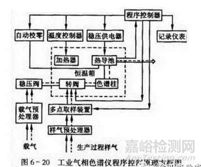 工業(yè)用氣相色譜儀,是在實驗室氣相色譜儀的基礎(chǔ)上發(fā)展起來的一種工業(yè)流程用自動成分分析儀,原理上與實驗室氣相色譜儀一樣,它的特點是整個分析過程由程序控制器控制,按一定程序自動進行,其原理方框圖如圖4所示。