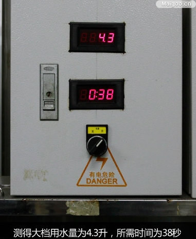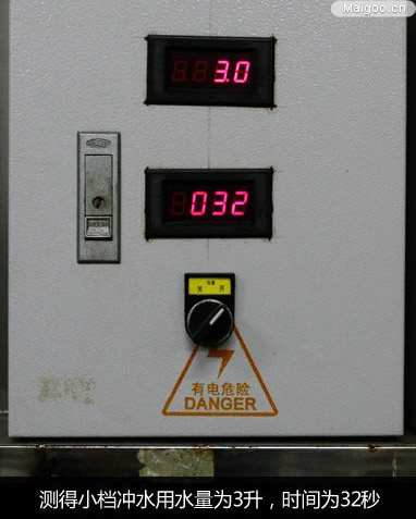 由于用水量難以用肉眼觀察,所以我們利用電子儀器對馬桶用水量進行測量。儀器上方為每次馬桶使用水的升數(shù),而下方則是把用的水重新充進馬桶水箱所用的時間。對馬桶沖水開關(guān)小檔進行測試,測得用水量為3升,時間為32秒,小檔用水量屬正常水平。