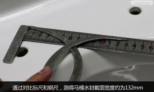 通過對比標(biāo)尺和鋼尺,測得馬桶水封截面寬度約為132mm。水封截面的長度和寬度分別為183mm、132mm。此款馬桶的水封截面面積遠(yuǎn)高于國標(biāo),大面積的水封防臭防蟲效果更有保證。