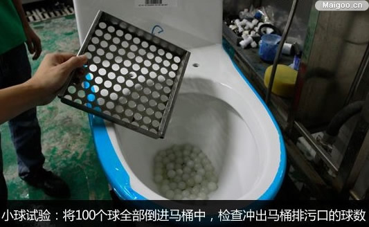 其中,小球試驗是指:將100個直徑為19±0.4mm、重量為3.05±0.15g的聚丙烯球全部倒進馬桶中,啟動沖水裝置,檢查并記錄沖出馬桶排污口的球數(shù),連續(xù)進行三次,以三次沖出的平均數(shù)不小于85個為合格,否則為不合格。
