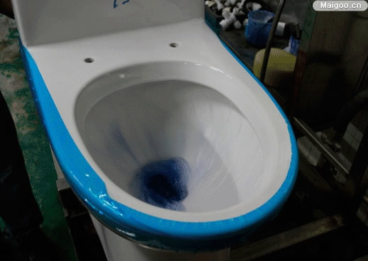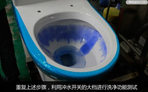 重復(fù)上述步驟,用軟筆在坐便器圈下位置,沿四周畫一圈墨水線,大面積藍色墨水相隔一段距離依舊會有一條墨線產(chǎn)生,而這次我們將利用沖水開關(guān)的大檔進行洗凈功能測試。