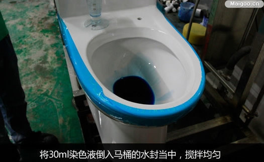所以,國標(biāo)對此提出了污水置換試驗。污水置換試驗是將30ml染色液倒入馬桶的水封當(dāng)中,攪拌均勻,然后由水封水中取10ml溶液至容器中,按照測試沖水檔位的大小,稀釋至不同濃度作標(biāo)準(zhǔn)液使用,最后將標(biāo)準(zhǔn)液與沖水后水封水的顏色作對比。假如水封水顏色比標(biāo)準(zhǔn)液顏色要淺,說明污水置換率符合標(biāo)準(zhǔn)。
