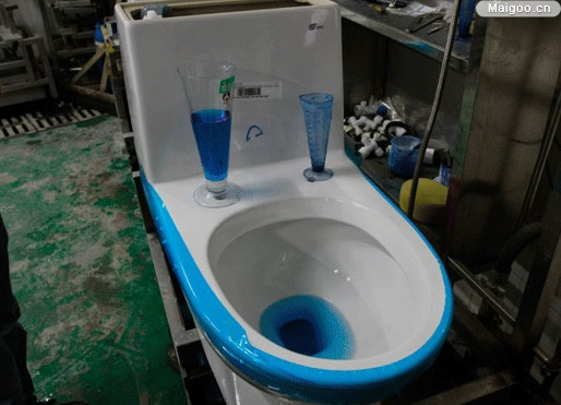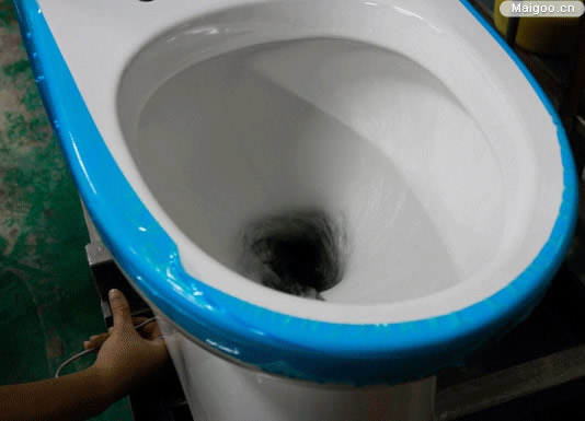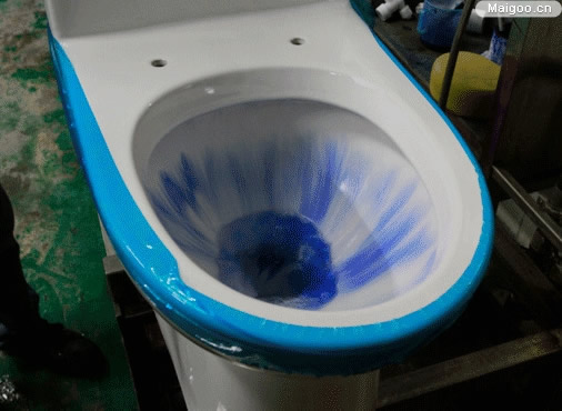 用軟筆畫完一圈以后,藍色墨水會沿著馬桶內(nèi)壁順流而下,將整個內(nèi)壁染成藍色,大面積藍色墨水相隔一段距離就會有一條墨線產(chǎn)生。此時按動沖水開關(guān)的小檔,可見墨水受到均勻分布出水口的水流作用,墨線拉長變窄,然后逐漸消失,雖然不能完全洗凈,但最后僅有幾條長度不足10mm的墨線殘留。