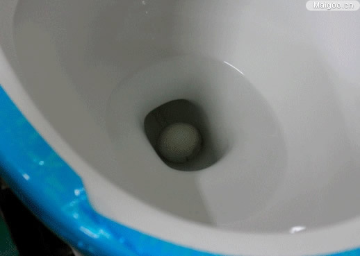 而此次我們將選用直徑為44mm的固體球進行試驗。將固體球放到排污管前端,固體球因重力作用直接沉到底下,按動沖水開關(guān),強勁的水流眨眼間便將固體球沖出排污管外,并沒有卡在管道中。面對過球直徑試驗,此款馬桶也能輕松應(yīng)付。