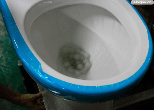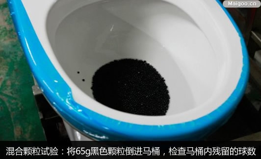 將65g的黑色聚乙烯顆粒(約為2500個),直徑為3.80±0.25mm,厚度為2.64±0.38mm,全部倒進馬桶中,然后啟動沖水裝置,檢查并記錄馬桶內(nèi)殘留的球數(shù),連續(xù)進行三次,以三次殘留的平均數(shù)不多于125個為合格,否則為不合格,這就是混合顆粒試驗的要求。