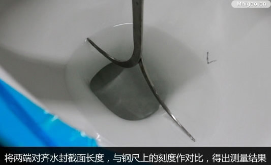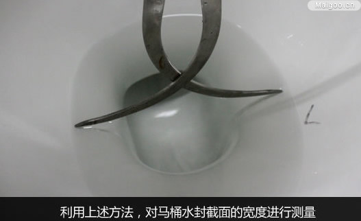 對于水封的截面面積,國標(biāo)也有相關(guān)規(guī)定:馬桶的水封截面長度與寬度不得少于100*85mm。與我們用米尺測量不同,此次測量使用的工具較為特別,為人字形可活動標(biāo)尺。將兩端對齊水封截面長度,然后與鋼尺上的刻度作對比,得出測量結(jié)果。