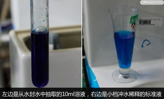 將30ml的染色液倒進水封當(dāng)中,攪拌均勻后,取出10ml,加水稀釋至170ml作為標(biāo)準(zhǔn)液(國標(biāo)小檔沖水標(biāo)準(zhǔn)稀釋率為17)。然后按動小檔沖水開關(guān),取沖水后的水封水與標(biāo)準(zhǔn)液顏色作對比。