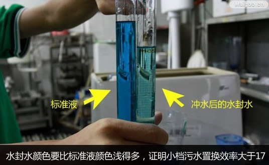 左邊試管里的是標(biāo)準(zhǔn)液,而右邊試管里的是沖水后的水封水。通過觀察可以發(fā)現(xiàn),水封水顏色明顯要比標(biāo)準(zhǔn)液顏色淺得多,證明小檔污水置換效率大于17,馬桶能通過污水置換實驗。
