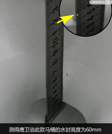 所謂水封,是指馬桶內(nèi)的存水,可以起到阻隔異味上返的作用,存水的多少決定了阻隔異味能力的大小。其中,水封高度是指排污管上頂端到水面的距離,國標(biāo)規(guī)定:馬桶的水封高度不得低于50mm。我們用鋼尺對馬桶水封高度進行測量,測得鷹衛(wèi)浴此款馬桶的水封高度為60mm,此高度達到國標(biāo)之余,還能避免水封過深引起濺水的問題。
