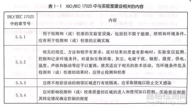 表1-1給出了在ISO/IEC 17025中與實驗室建設相關的內容。