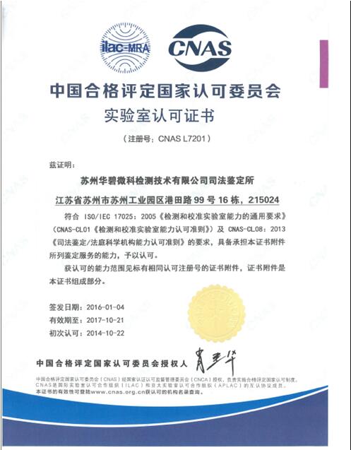 日前,蘇州華碧司法鑒定所順利通過中國合格評定國家認可委員會(CNAS)所派評審組的現(xiàn)場監(jiān)督評審,并換領(lǐng)了新版中國合格評定國家認可委員會實驗室認可證書,注冊號:CNAS L7201。