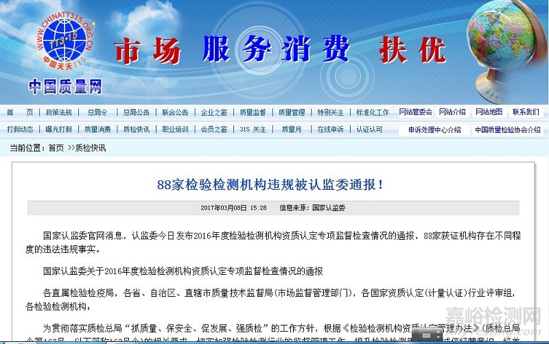 2016年3月8日,中國國家認(rèn)證認(rèn)可監(jiān)督管理委員會(huì)(以下簡稱“國家認(rèn)監(jiān)委”)在其官網(wǎng)發(fā)布了國家認(rèn)監(jiān)委關(guān)于2016年度檢驗(yàn)檢測(cè)機(jī)構(gòu)資質(zhì)認(rèn)定專項(xiàng)監(jiān)督檢查情況的通報(bào),公布了251家獲證檢驗(yàn)檢測(cè)機(jī)構(gòu)的檢查結(jié)果,其中88家獲證機(jī)構(gòu)存在不同程度的違法違規(guī)事實(shí),包括生物醫(yī)療領(lǐng)域相關(guān)機(jī)構(gòu)有襄陽市疾病預(yù)防控制中心、農(nóng)業(yè)部轉(zhuǎn)基因生物食用安全監(jiān)督檢驗(yàn)測(cè)試中心、重慶市江津區(qū)疾病預(yù)防控制中心、阜康市疾病預(yù)防控制中心、廣州金域醫(yī)學(xué)檢驗(yàn)中心有限公司。
