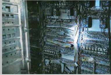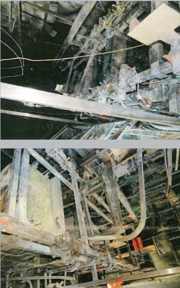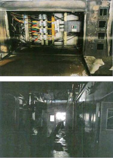 現(xiàn)場勘驗發(fā)現(xiàn),涉案生產(chǎn)線廠房(夾芯板分割區(qū)域)燒毀嚴重,頂部吊頂坍塌,廠房總配電柜內(nèi)斷路器為斷開狀態(tài),未發(fā)現(xiàn)自動跳脫的斷路器;生產(chǎn)線控制柜斷路器處于閉合狀態(tài),未發(fā)現(xiàn)有自動跳脫的斷路器。生產(chǎn)線控制柜內(nèi)線槽變形嚴重。PLC及變頻器外部殼體熔融變形。生產(chǎn)線控制柜旁的PC機外部殼體熔融。生產(chǎn)線整體燒毀嚴重,傳動皮帶完全燒毀,平臺配線燒毀嚴重,總線周圍的PVC隔板基本燃燒完全,且在接線處發(fā)現(xiàn)熔珠。在與移載機1區(qū)域相對應(yīng)的生產(chǎn)線頂部存在水泥剝落現(xiàn)象,未見煙熏痕跡,而在周邊區(qū)域以及架空線均存在明顯的煙熏痕跡。