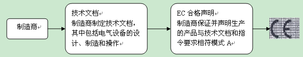 低電壓指令采用模式A,即制造商的自我聲明的合格評定方式。由制造商自己對產(chǎn)品進(jìn)行評價,如果符合法規(guī)要求,制造商簽發(fā)符合性聲明,直接在產(chǎn)品上使用CE標(biāo)志。政府不參與評定過程,只負(fù)責(zé)產(chǎn)品投放市場后的監(jiān)督。具體見以下流程圖: